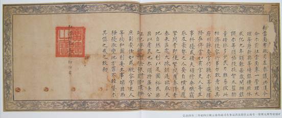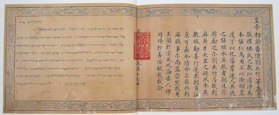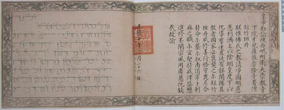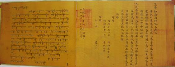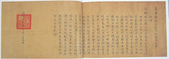皇帝敕谕番僧箚失竹罕(?)卷等:朕惟佛氏之教,以清净为本,能仁为用,上以阴翊皇度,下以化导群迷,凡其徒之能继承其教者,朝廷亦奖励之。尔箚失竹乃故剌麻奔牙失里之姪,夙承其教,祇勤善行,远来朝贡,诚意可嘉。今特命尔袭叔剌麻职事,尔尚益崇梵教,用丕阐于宗风,化诲番人,俾同归于善治。钦哉,故谕。正统十三年五月十七日(广运之宝)。(参见图6
