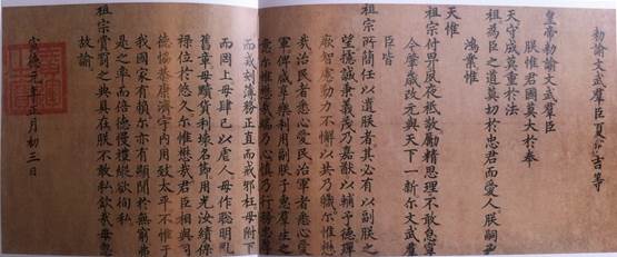 勅谕文武群臣夏元(原)吉等。皇帝敕谕文武群臣:朕惟君国莫大于奉天,守成莫重于法祖。为臣之道,莫切于忠君而爱人。朕嗣承鸿业,惟天惟祖宗付畀,夙夜祇敬,励精思理,不敢怠宁。今肇岁改元,与天下一新,尔文武群臣,皆祖宗所简任以遗朕者。其必有以副朕之望,摅诚秉义,茂乃嘉猷,以辅予德,弹厥智虑,勤力不懈,以共乃职,尔惟懋哉。治民者悉心爱民,治军者悉心爱军,俾咸享乐利,用副朕子惠群生之意。尔惟懋哉。端乃心,慎乃行,务忠厚而戒刻薄,务正直而戒邪枉,毋附下而罔上,毋肆己以虐人,毋作聪明乱旧章,毋黩货利坏名节,用光汝绩,保禄位于悠久。尔惟懋哉。君臣相与同德协恭,康济宇内,用致太平,不惟于我国家有赖,尔亦有显闻于无穷。弗是之率,而倍德慢礼,纵欲徇私,祖宗赏罚之典具在,朕不敢私。钦哉毋忽,故谕。宣德元年正月初三日。(广运之宝)(参见图3