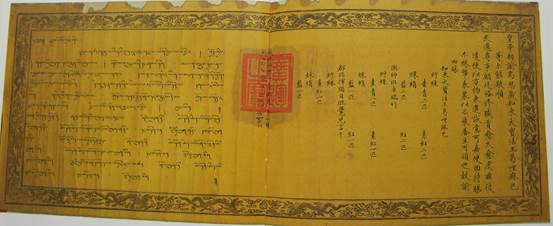皇帝敕谕陕西岷州卫大崇教寺下院牙儿萨族崇隆寺番僧短竹班丹:朕惟佛氏之教,清静圆明,慈悲利济,上以阴翊皇度,下以化导群迷。其徒有能阐扬其教者,国家必褒奖之。尔短竹班丹夙修善行,恪守毘尼。今特命尔袭尔叔南渴宁卜剌麻之职。尔宜坚持戒律,毖懋进修,丕阐宗风,用广慈化。钦哉,故谕。正德十年六月二十六日。(广运之宝)。(参见图7