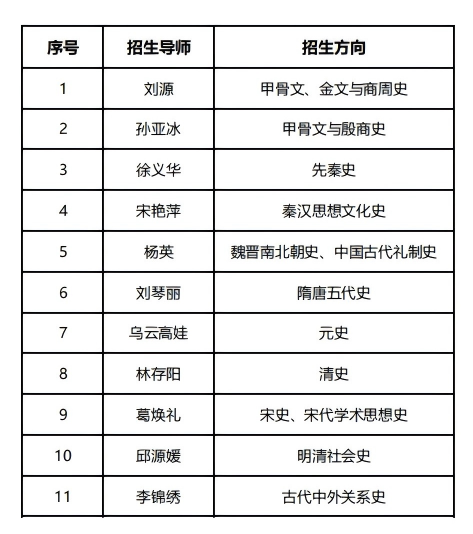 历史系2026年拟招收博士研究生11名,其中包括一个定向生名额。具体招生导师及方向如下: